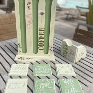 Wooden coffee capsules holder & coasters in rustic brown color
