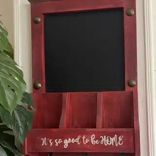 Wooden hanger with pockets in red farmhouse color and design with chalkboard for writing