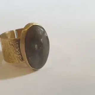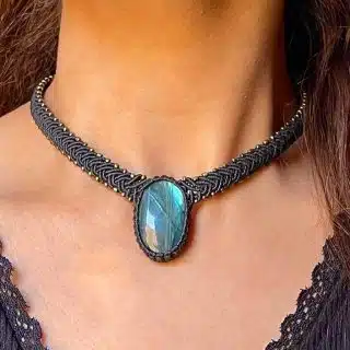 A Handmade adjustable necklace created with Labradorite crystal and brass woven by black cords making a statement piece.