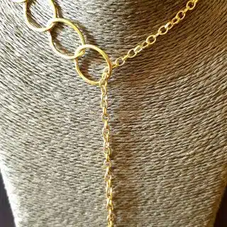A Handmade adjustable necklace created with Ivory pieces and brass woven by burgundy cords.