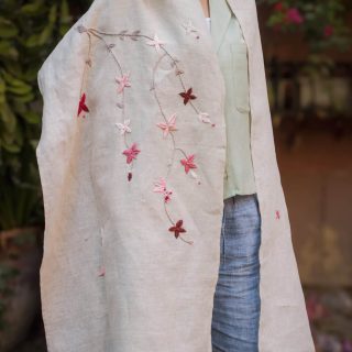 - Pure linen beige shawl hand embroidered with cherry blossoms pink hues.