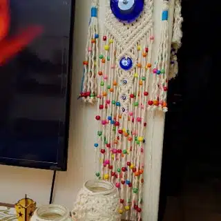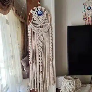 ديكور حائطي مكرمية يدوي بتصميم فريد يجمع بين الفن والرمزية، مزين بـ خرز العين الزرقاء للحماية من الحسد والطاقة السلبية، ومُزين بعناصر طبيعية مثل أوراق الموز المجففة بتنسيق فني أنيق.