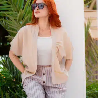 Full outfit (linen beige short cardigan+pure linen stripe pants )
