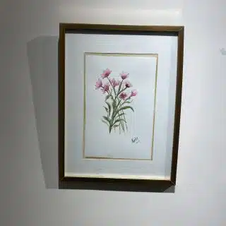 – This expressive painting features a striking female portrait with captivating blue eyes, bold pink lips, and flowing hair adorned with gold accents. Created with acrylic and oil paints and gold leaves, the artwork combines realism with abstract elements.