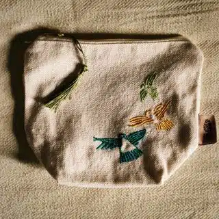 Mini cotton pouches with floral handmade embroidery and lace detail.