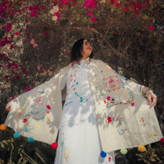 - Hand-embroidered with pompoms
