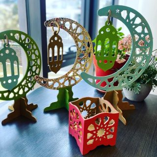 Set of 3 standing helal and a box for candle in bright colors decoration for Ramadan