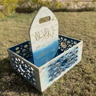 Wooden box for prayer matts and wear in degradée blue x beige with gold and silver effects