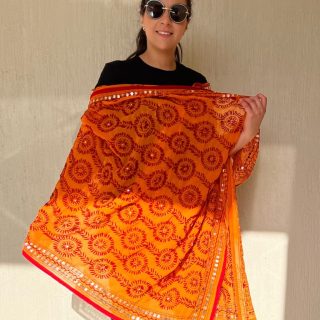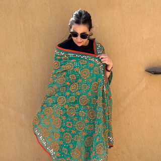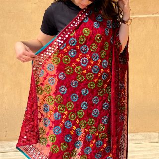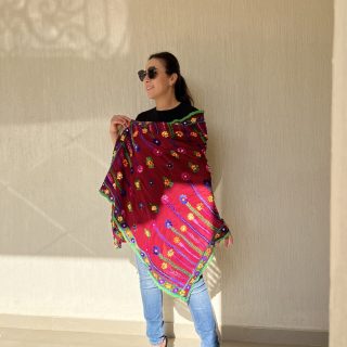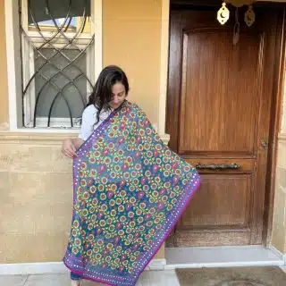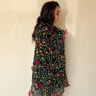 Pure linen beige shawl hand embroidered with colorful floral pattern.