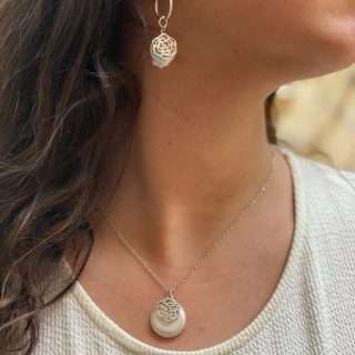 opal stones and off-white pearls with unique elegant pendants 2 purple in the shape of a star and 1 green in the shape of a shell -