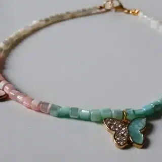 Anklet made of white/powder rose / baby blue seashell stones with rose and blue butterfly pendants