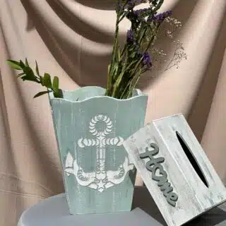 set of wooden hand-painted tissue box with home laser cut design and matching basket with 3D anchor design