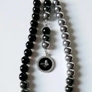 Bag charms made of black, dark grey and silver hematite stones and hanged a round pendant inside a butterfly with tiny diamond stones