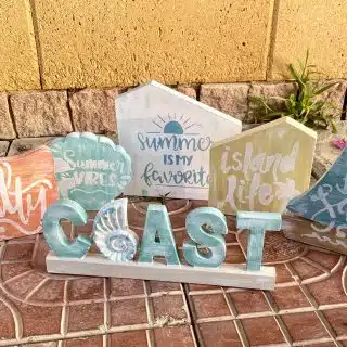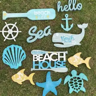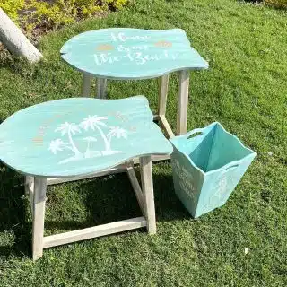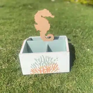 Wooden box for plates and drawer for cutlery organizer with sea shells and summer design