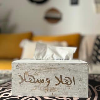 Wooden set of tissue box and basket in beige x brown colors with Arabic calligraphy design