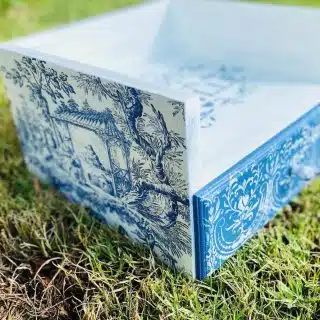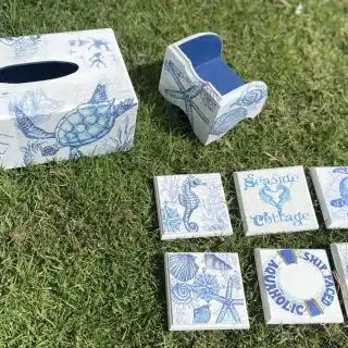 Full set in bleu blanc chinoiserie design: cutlery and plates holder, tissue box and new design of HOME coasters