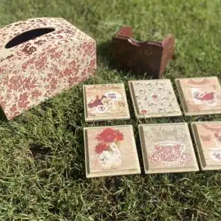 Wooden set tissue box and coasters for summer in turquoise x coral colors