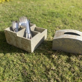 Wooden set of cutlery organizer & tissue box in griesh x gold classic designs