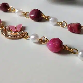 Glasses chain with pink and pearl stones with elegant butterfly pendant shape and gold plated pearl Chinese gold chain
