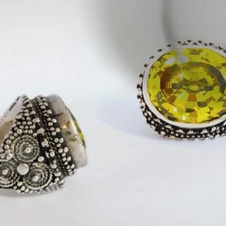 This is a handcrafted silver ring featuring a beautiful detailing with a vibrant swarofski centerpiece reveal elegance and bold sophistication.