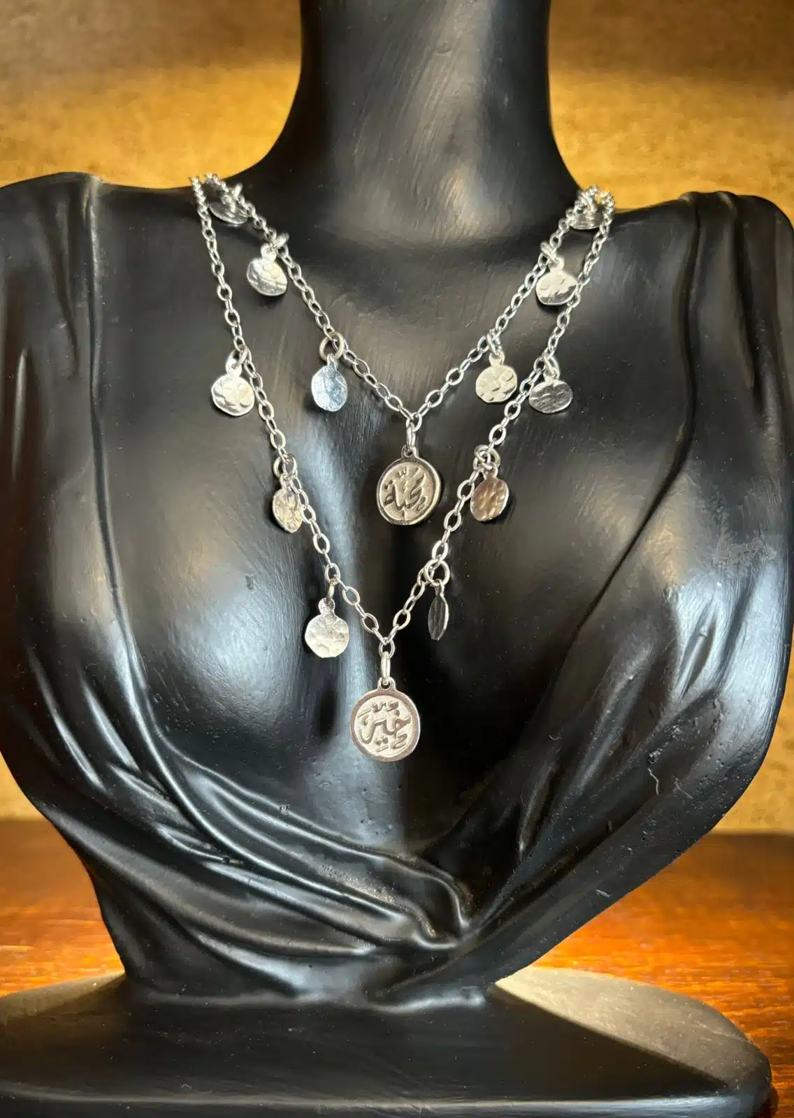 These are sterling silver necklaces platinum plated with Arabic pendant ( تفاؤل – خير )