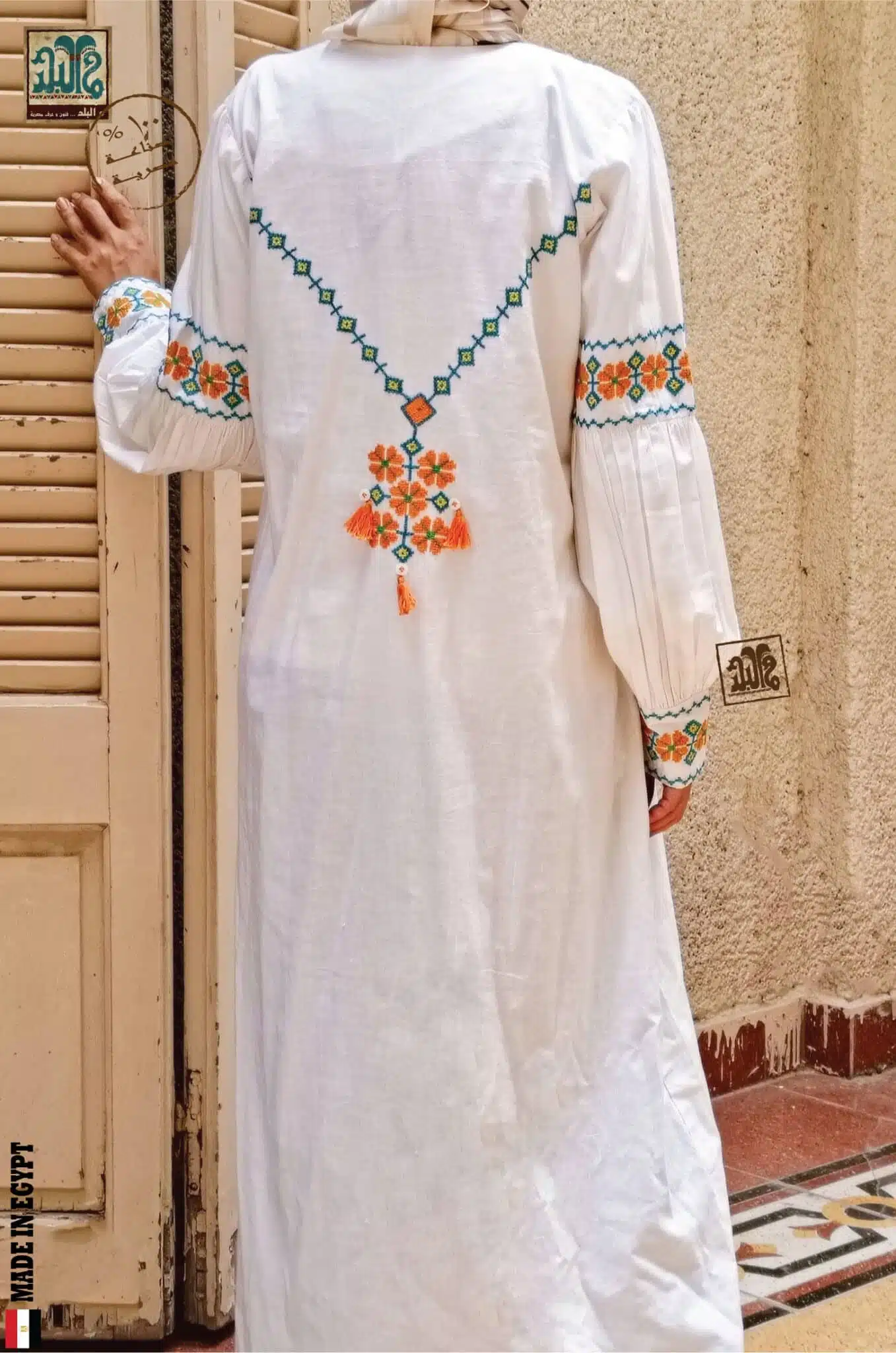 جلباب ابيض تطريز سيناوي بخيط ملون مع الزراير والشراشيب.