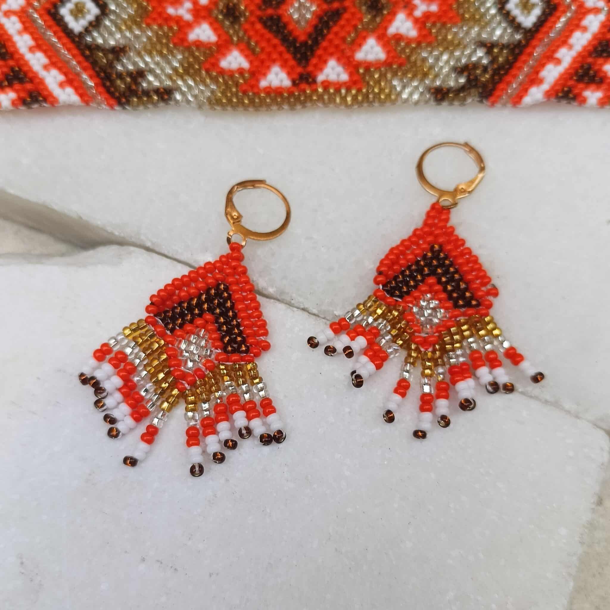 الوصف: حلق خرز تشيكي شغل إبرة بموتيفات هندسية مستوحاة من التراث السيناوي لمنطقة نويبع.
