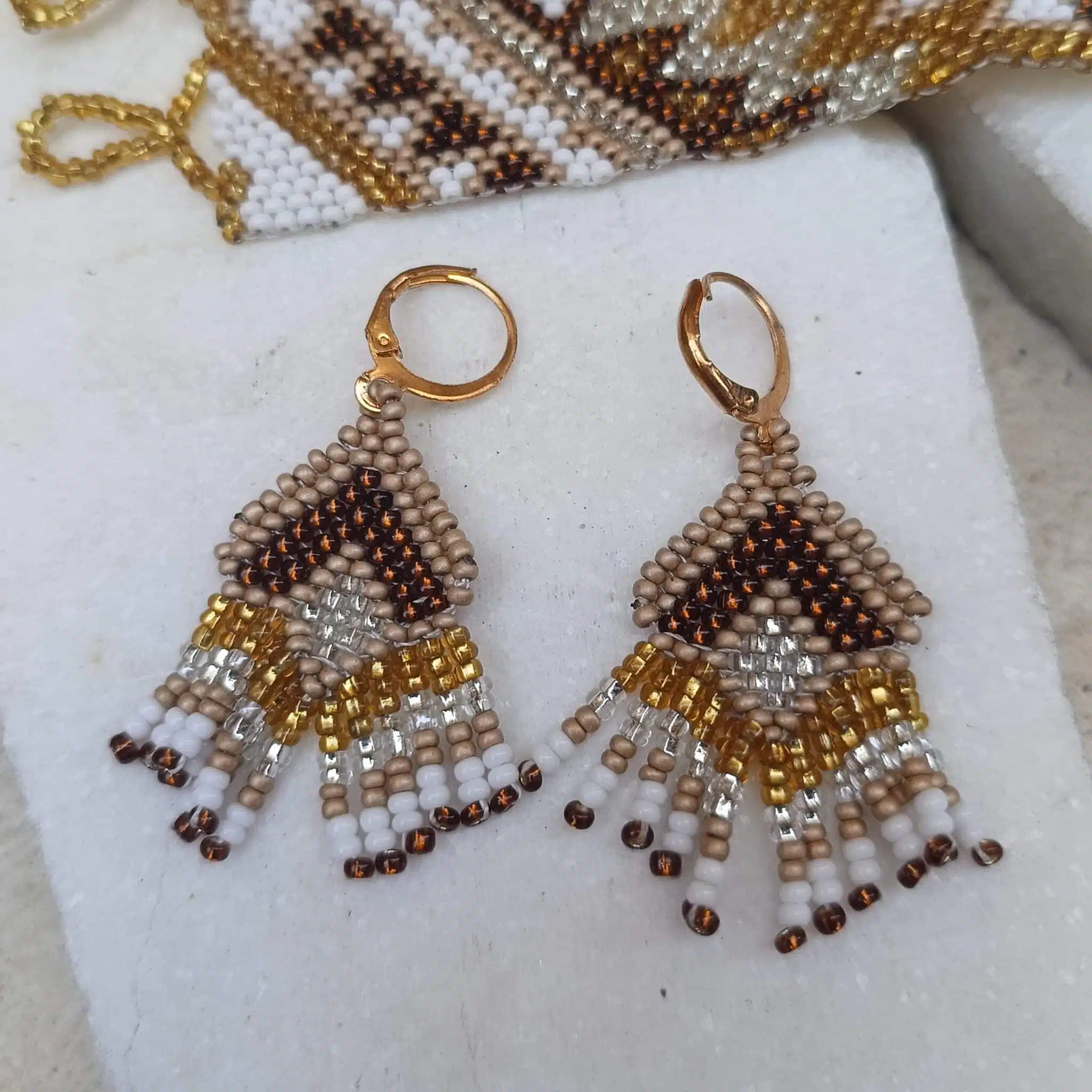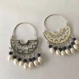 الوصف: حلق خرز تشيكي شغل إبرة بموتيفات هندسية مستوحاة من التراث السيناوي لمنطقة نويبع.