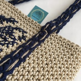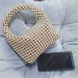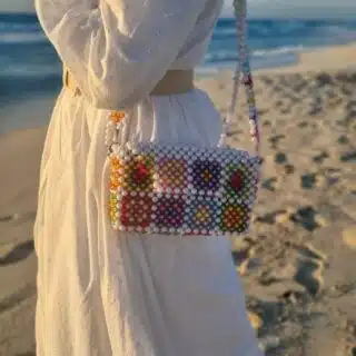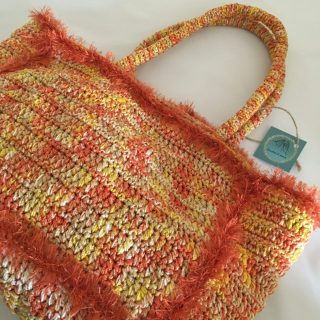 شنطة يد حريمي كروشية لون احمر مناسبة للصيف و البحر ، مزينة بقلب ذهبي كبير من الخرز.