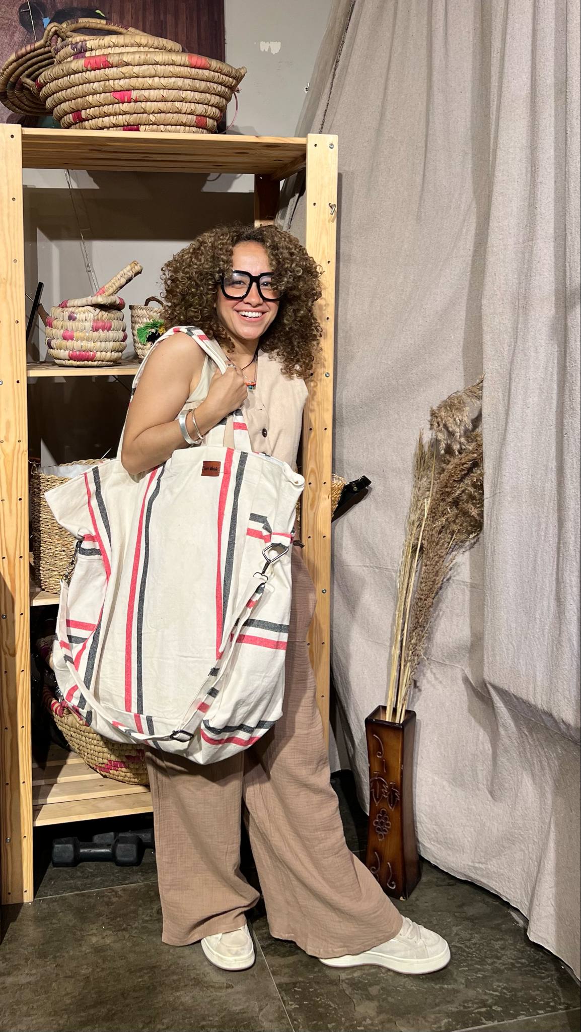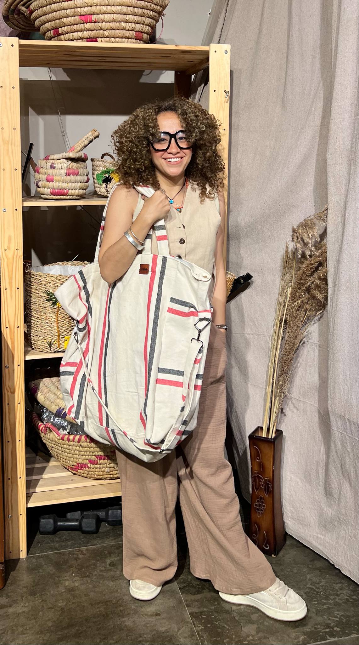 “اكتشفي الأناقة العملية مع هذه الشنطة الكبيرة المصنوعة من الكتان بتصميم واسع يوفّر لكِ مساحة مثالية لحمل كل احتياجاتك اليومية