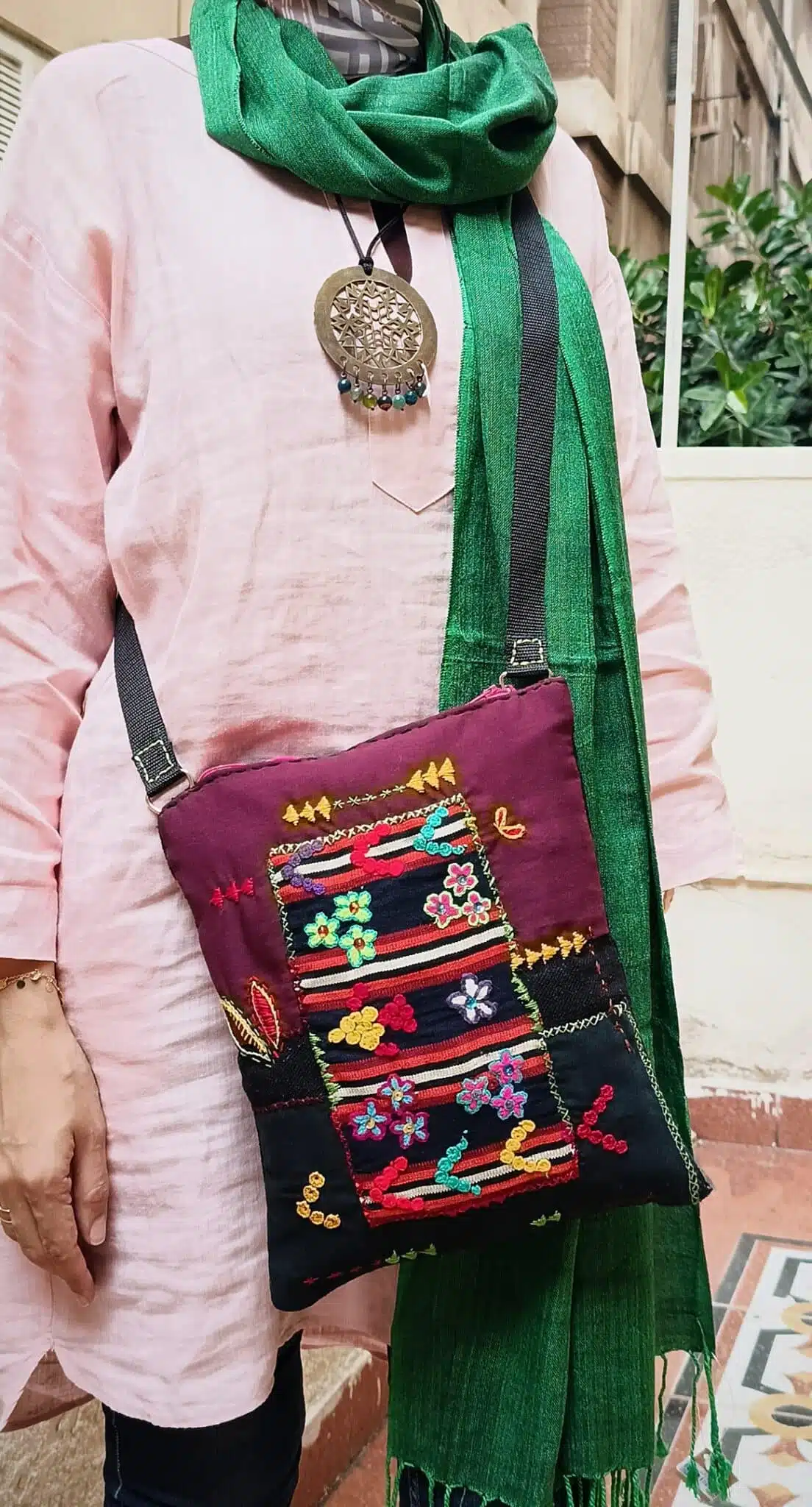 الوصف : شنطة كروس سيوة يدوي تطريز بخيط الصوف مع الزراير والترتر بأسلوب ال Patchwork.