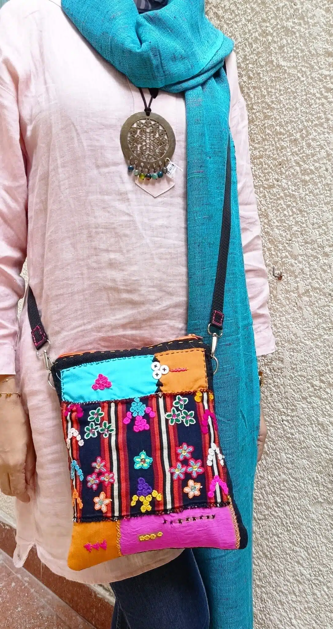 الوصف : شنطة كروس سيوة يدوي تطريز بخيط الصوف مع الزراير والترتر بأسلوب ال Patchwork.