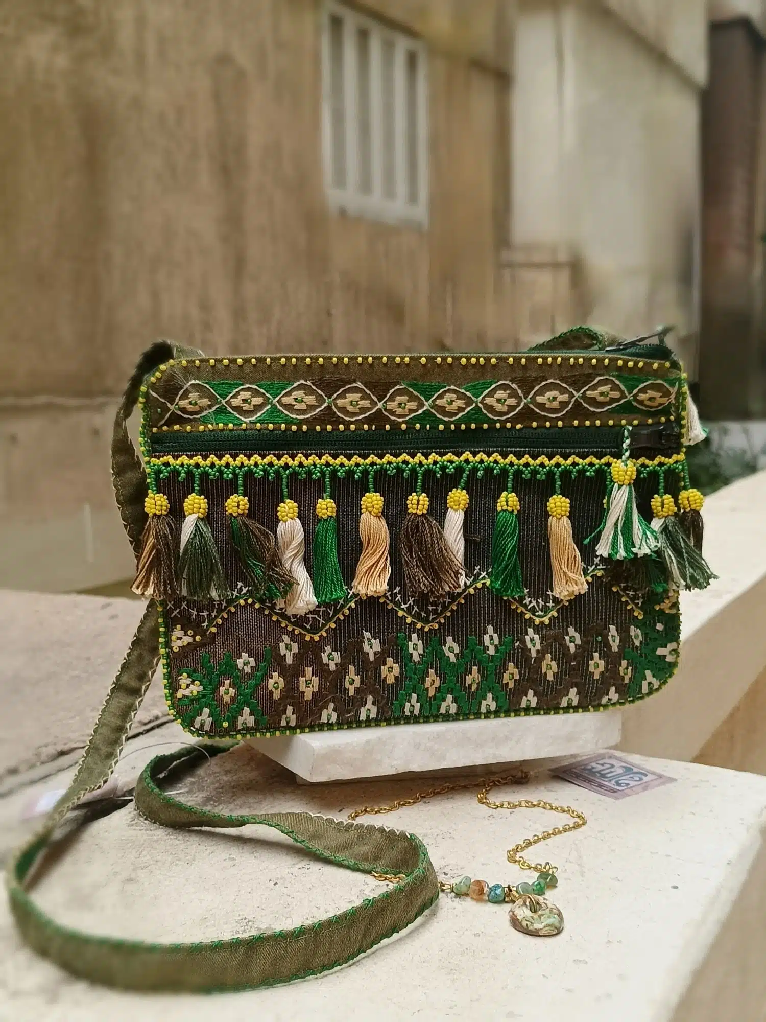 الوصف: شنطة كروس مستطيلة تطريز جنوب سيناء، 3 سوستة، بيد شريط حزام و تطريز خيط قطن مع خرز .