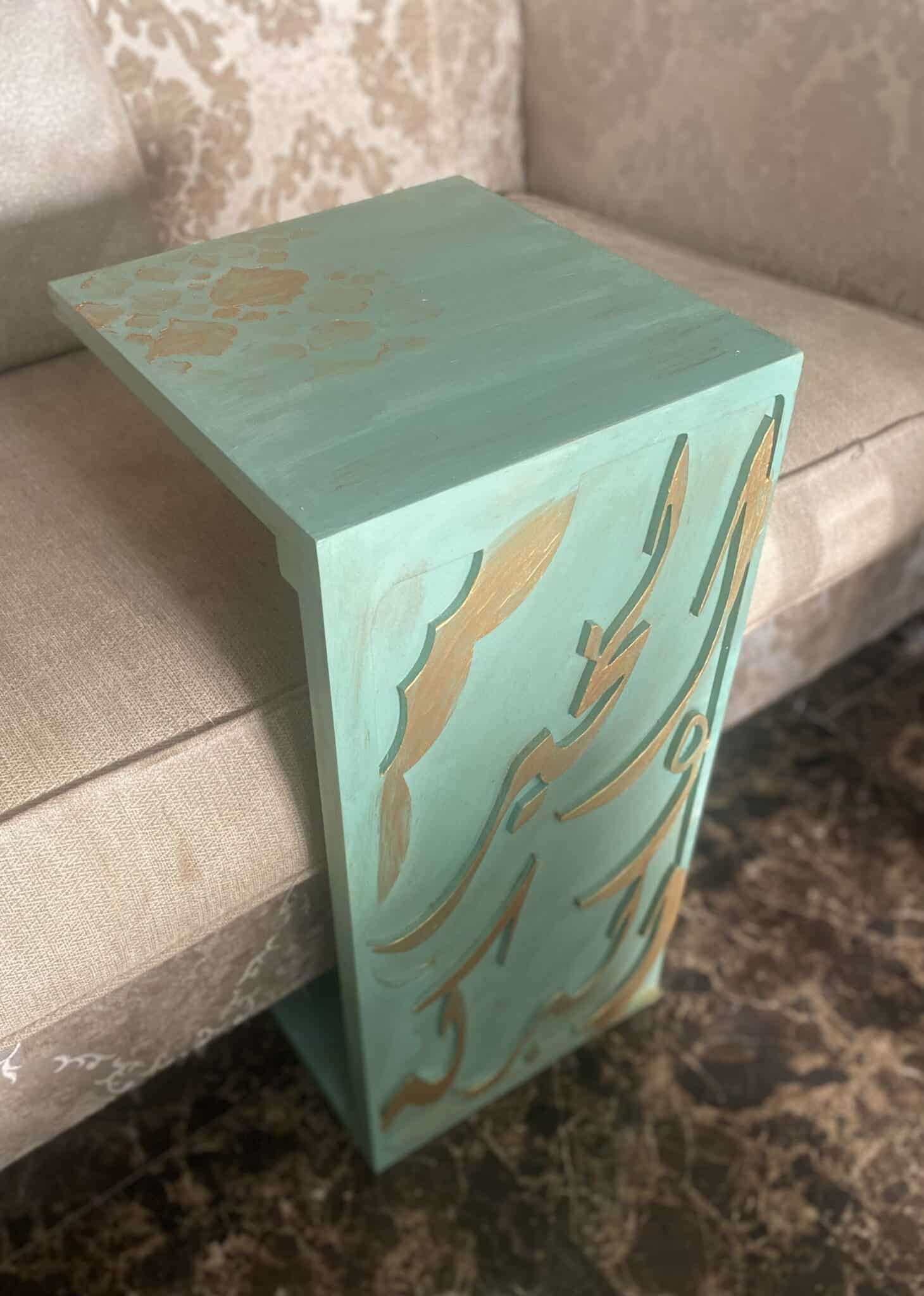 Wooden sofa side table with Arabic calligraphy “الخير والبركة”