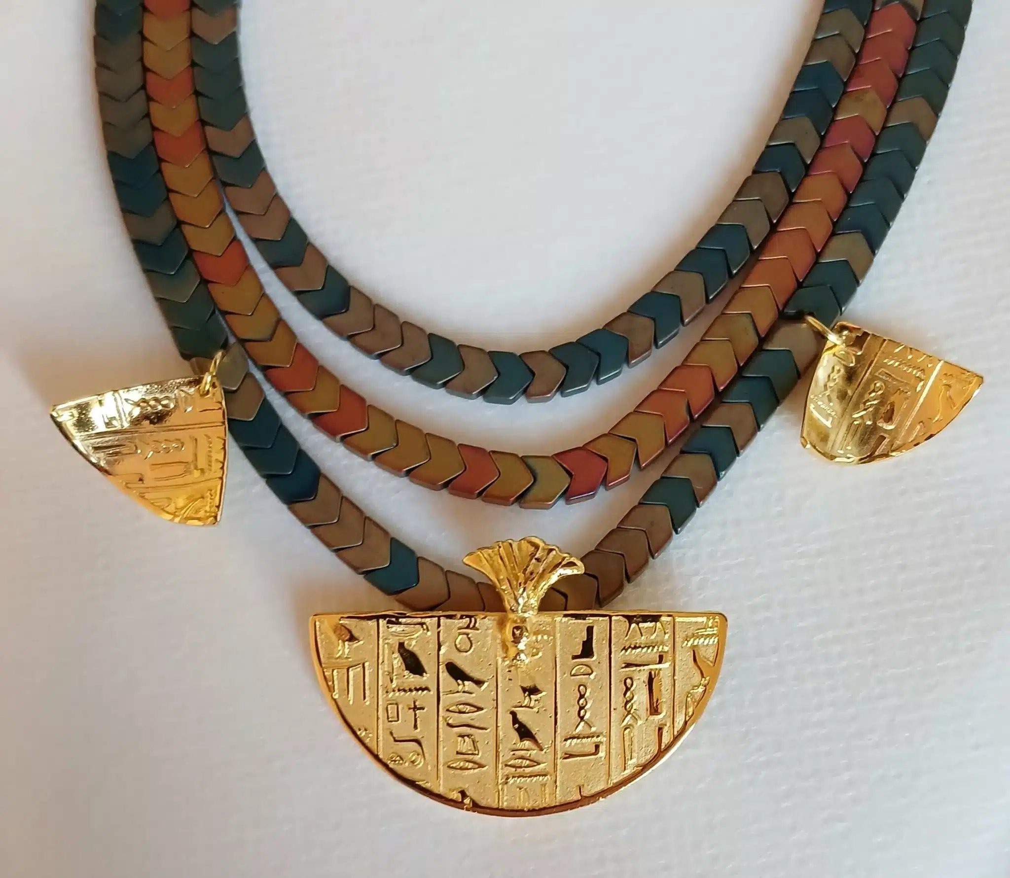 3 layers hematite stones necklace with 3 pharoah gold plated 18 k pendants
