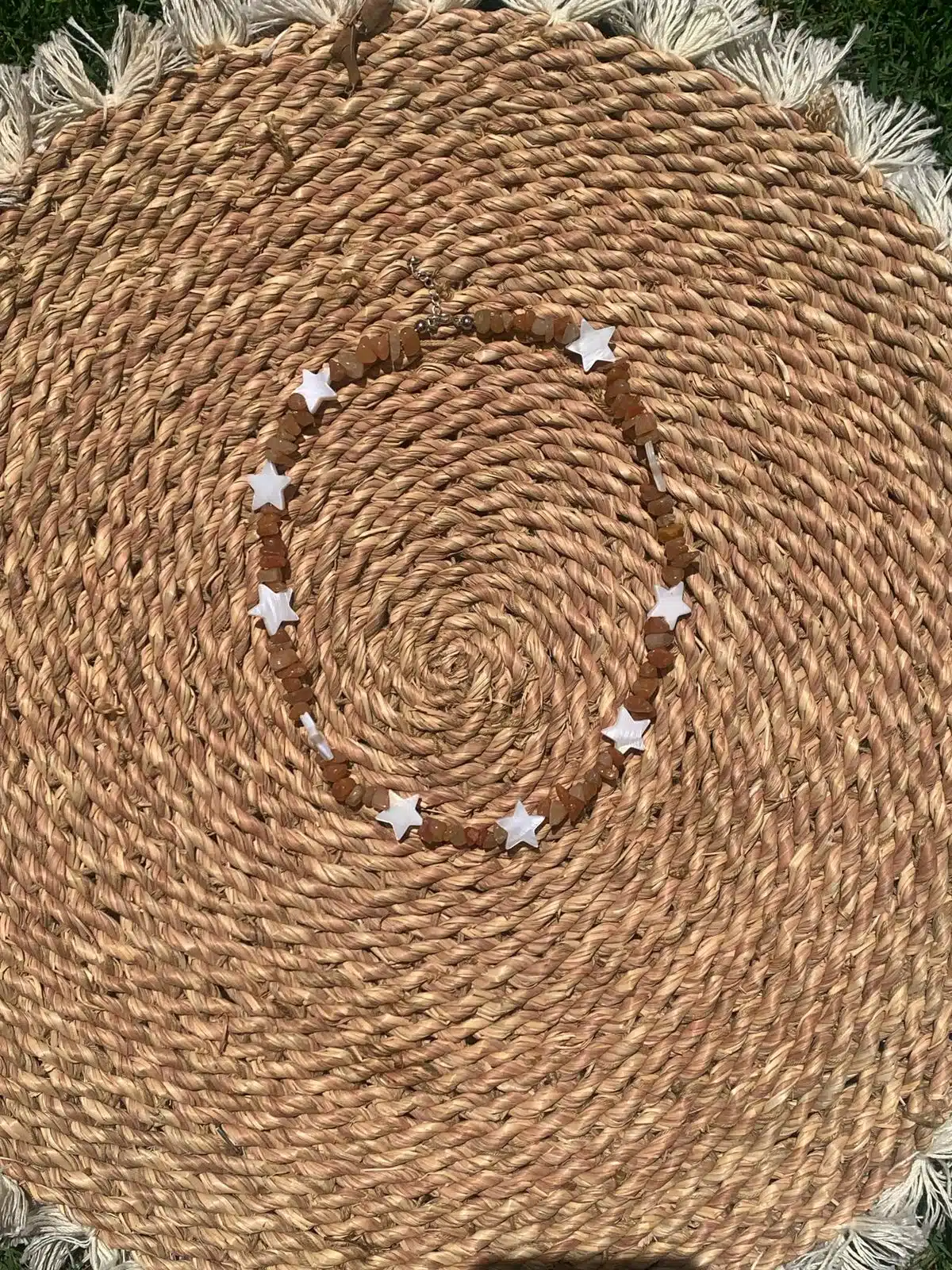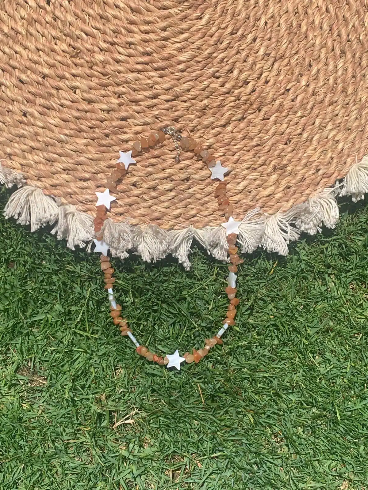 استمتع بجمال الشاطئ الساحر مع قلادتنا “همس الساحل”. تتميز بحبات العقيق البني الدافئ وأصداف بحرية رقيقة، مع قفل وسلسلة من الفضة عيار 925 لإضفاء لمسة من الأناقة الخالدة