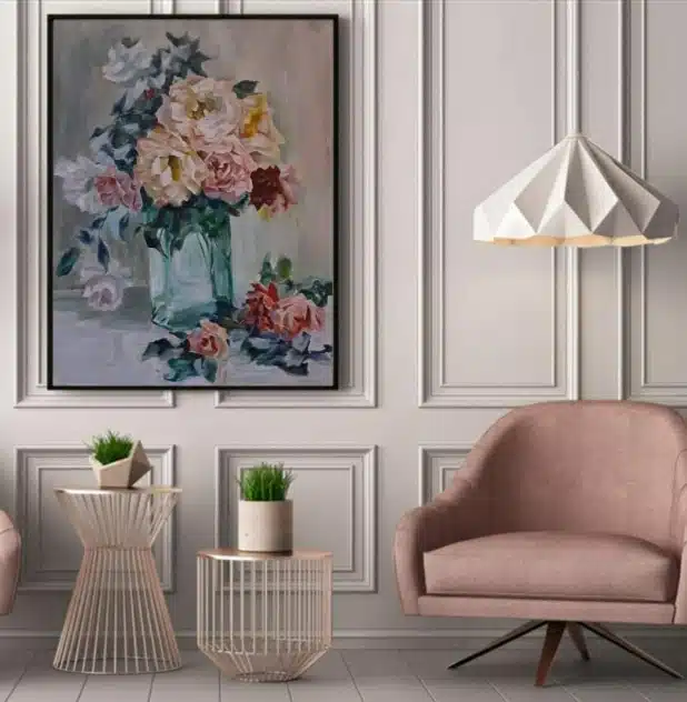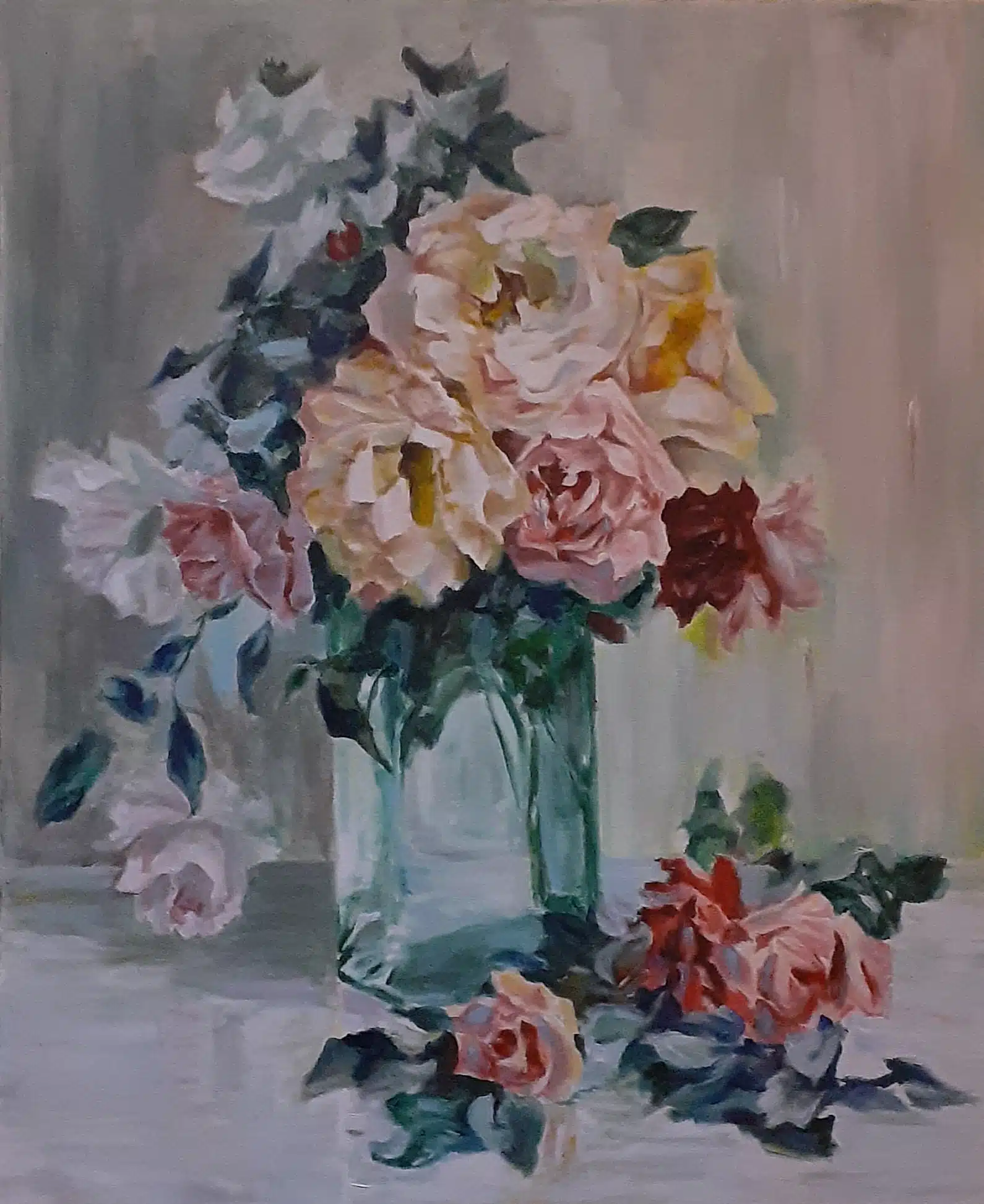 I am lucky to have this painting boasting a strategic place in my home. Every petal is carefully drawn and painted and the vase gives a brilliant reflection when you look at it from different sides. She attend to every minute detail. Looking at the painting gives a great soothing effect.