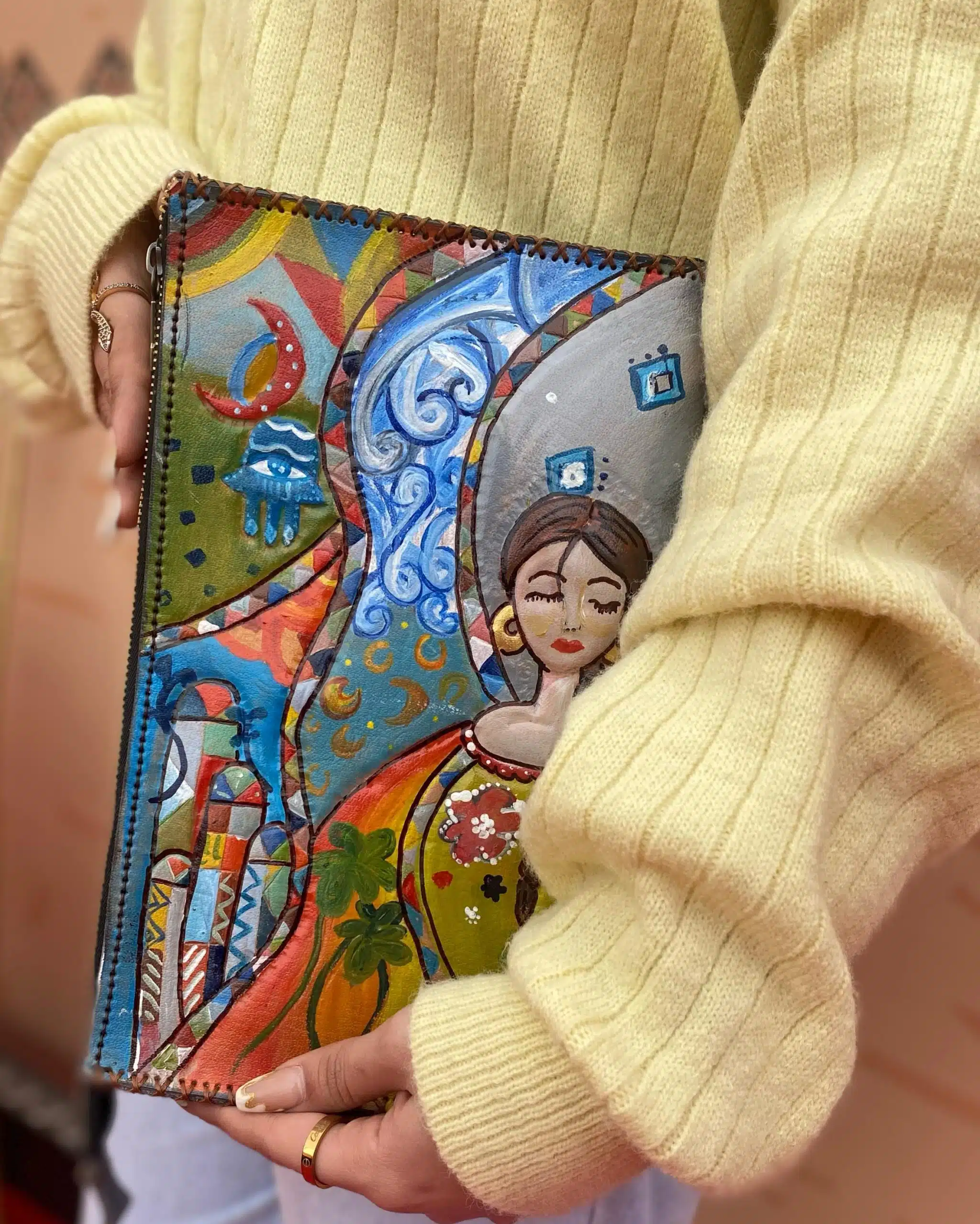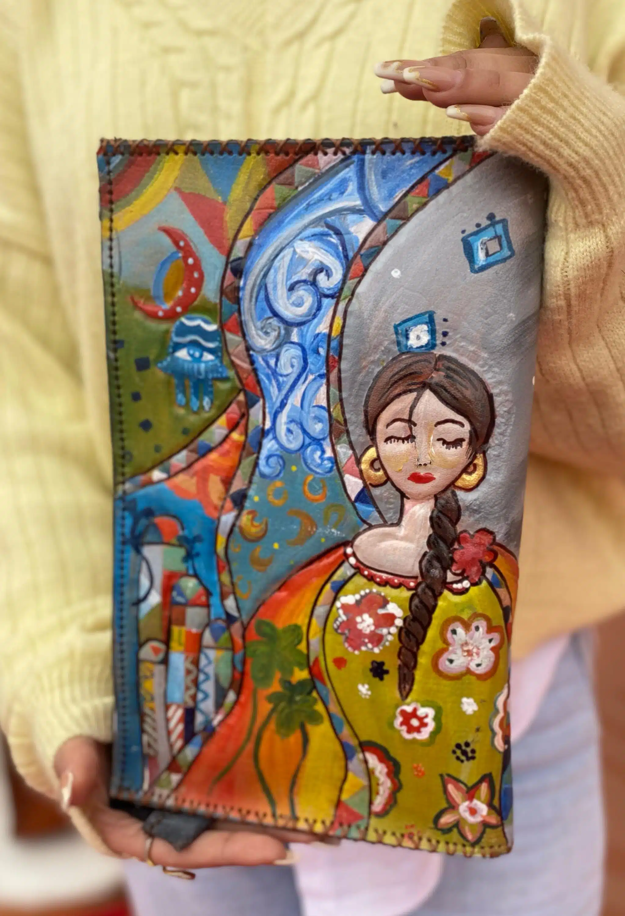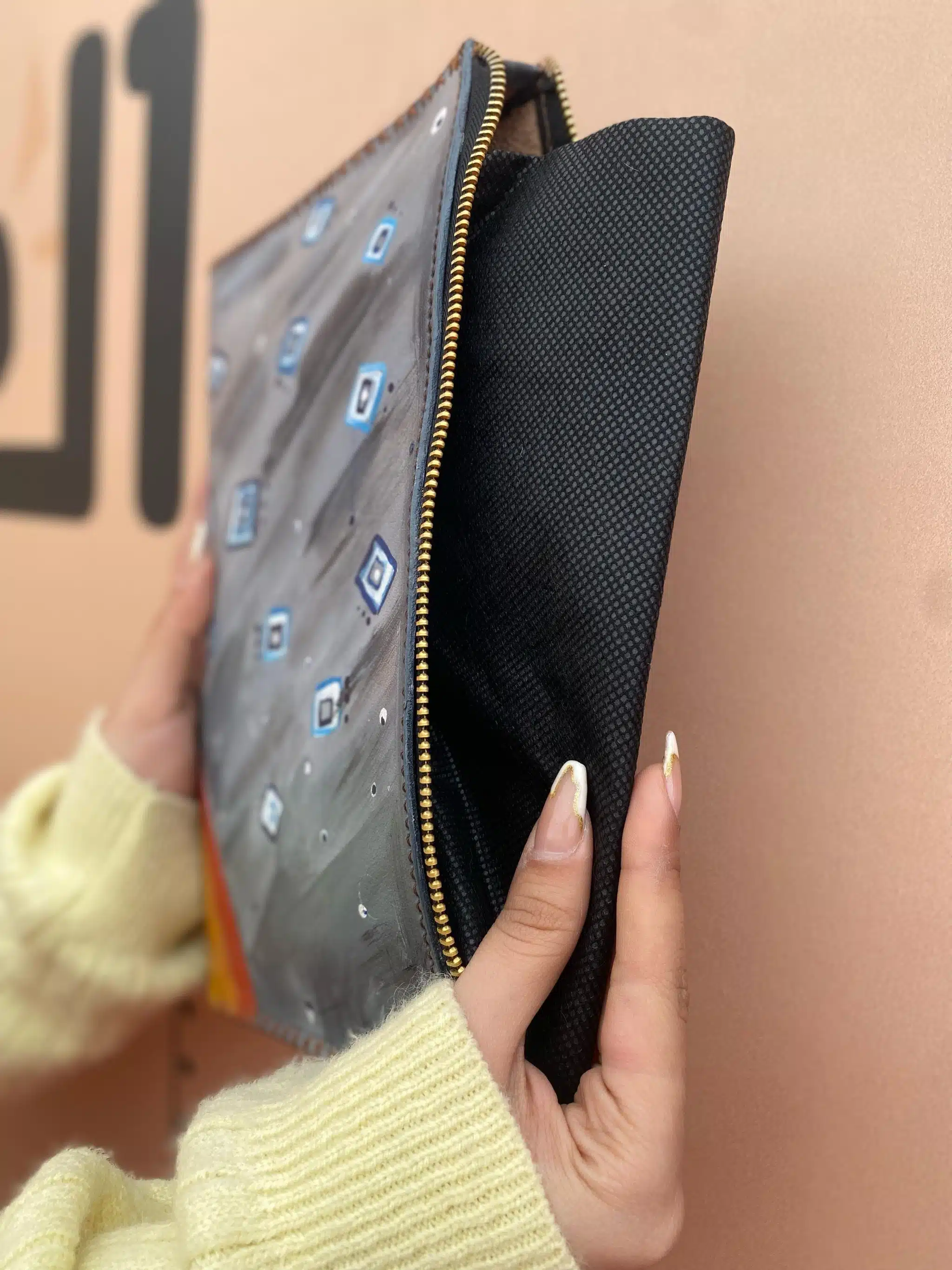 A genuine leather clutch bag with distinctive, embossed designs, suitable for all occasions. Dimensions: 28 x 18 x 2 cm