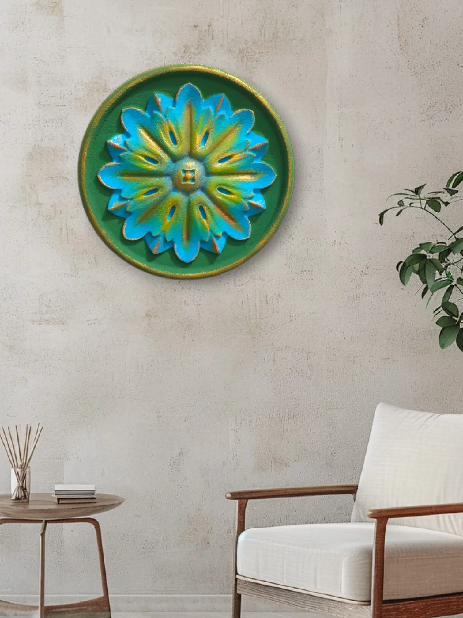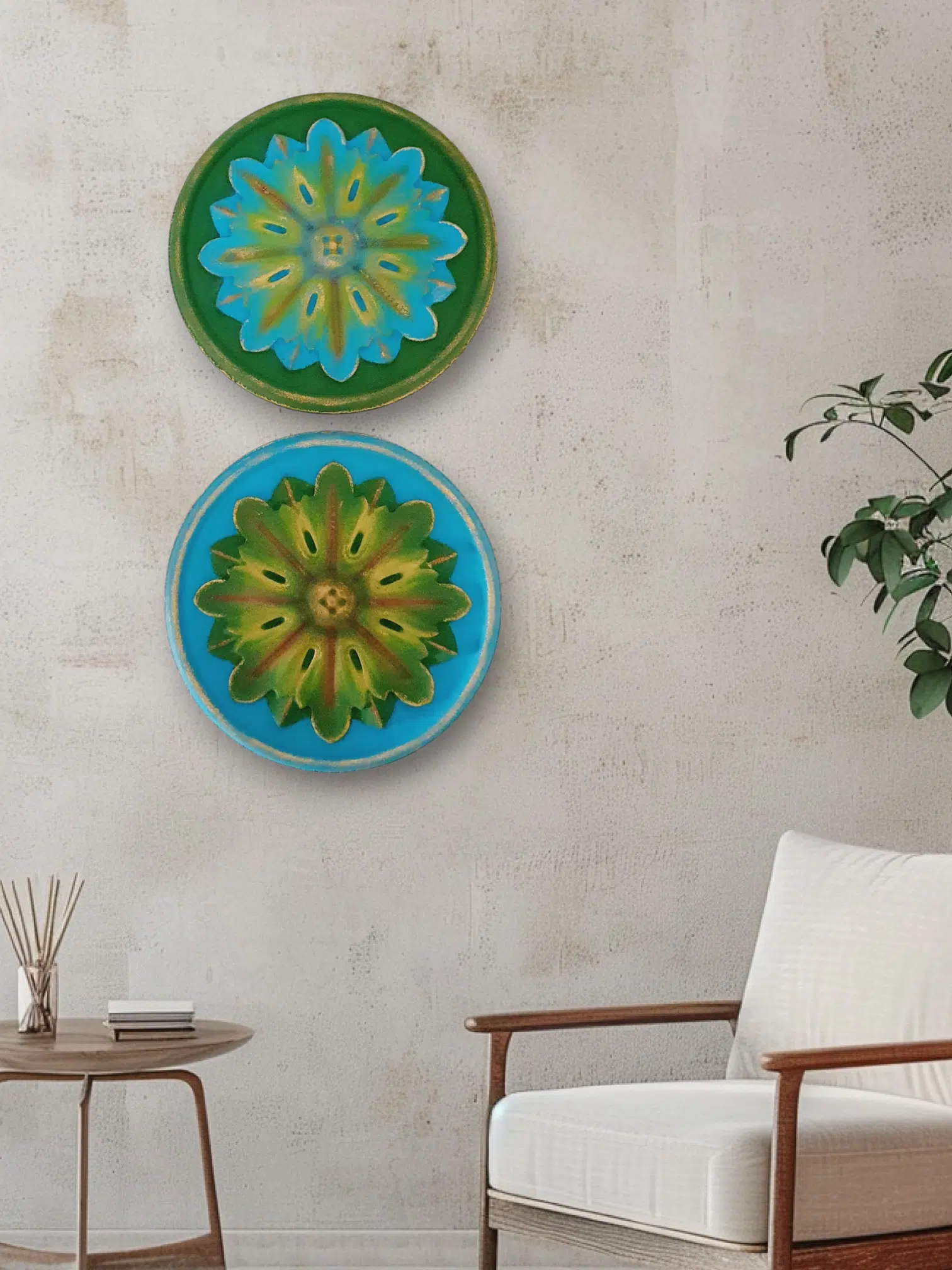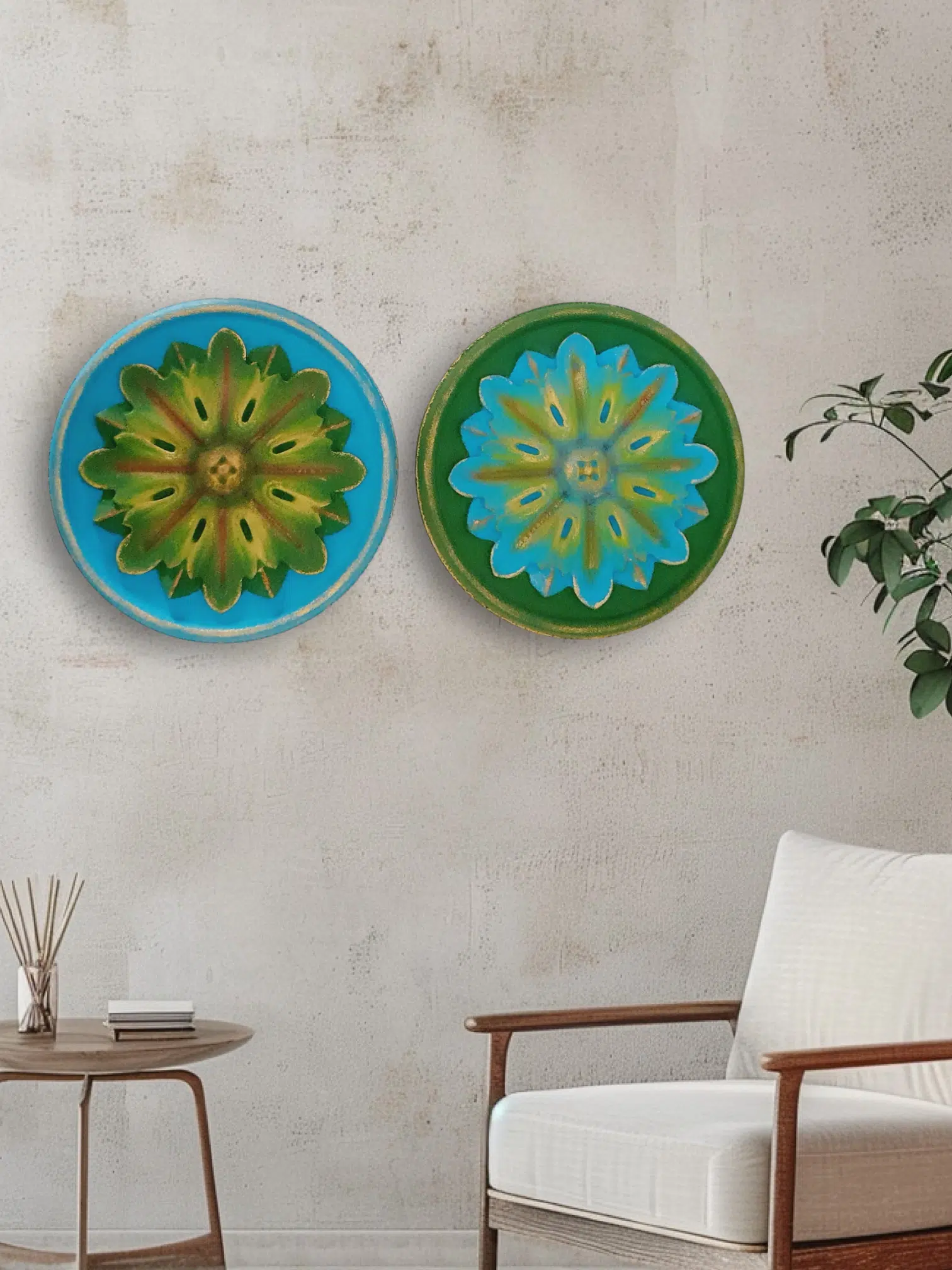 A set of 2D floral wall decorations with matching colors