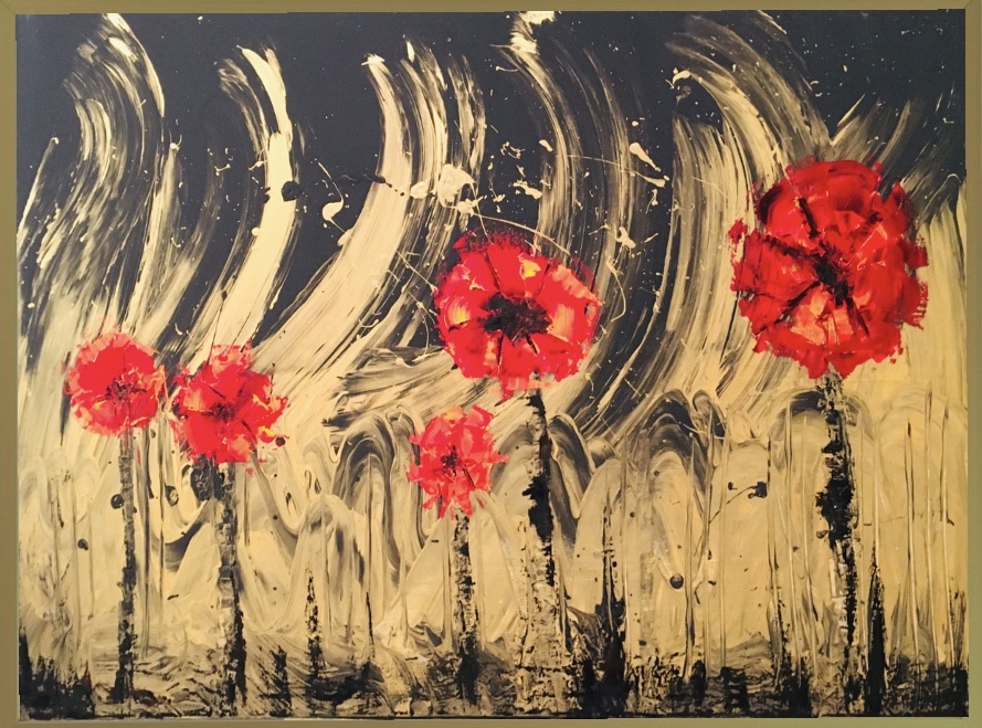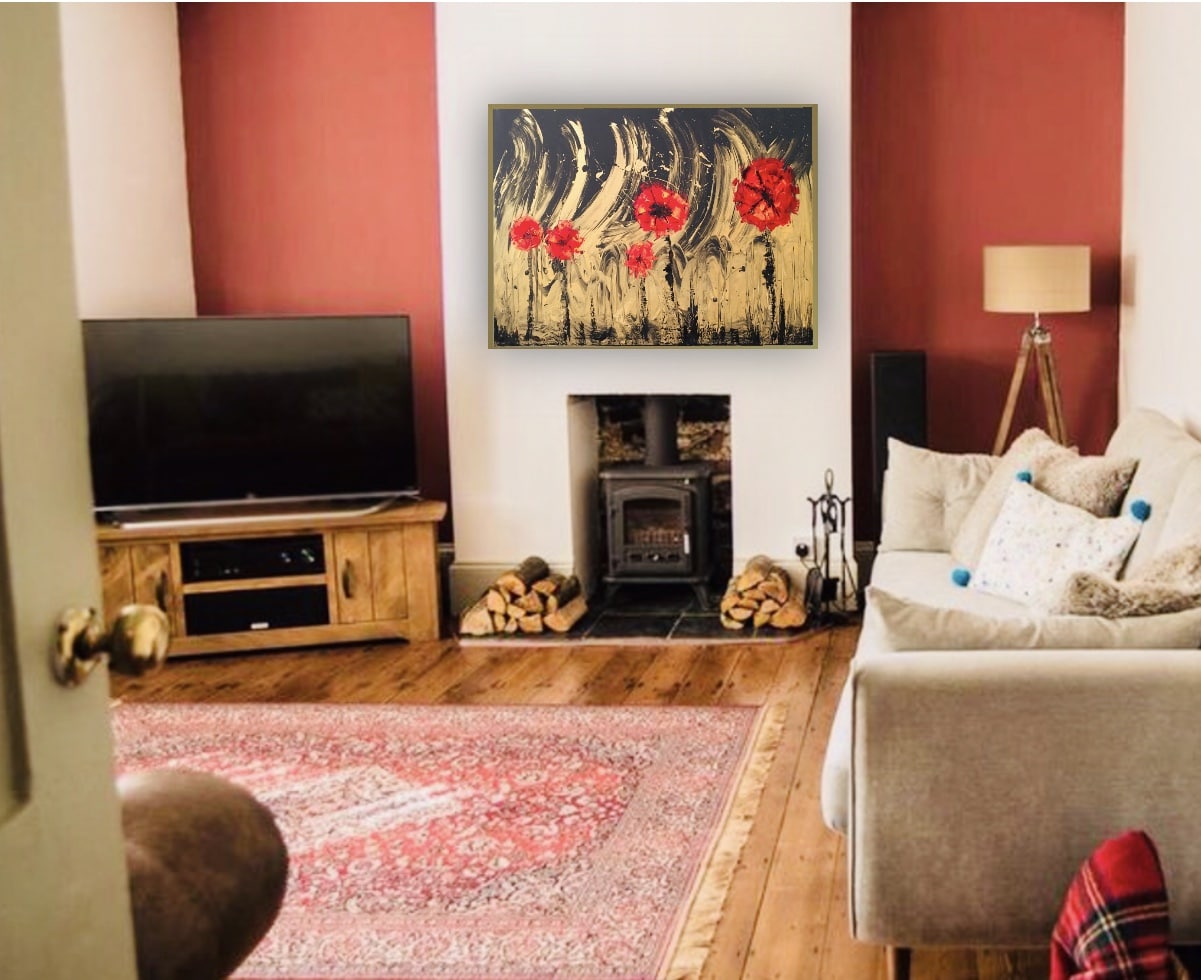 • Large abstract floral painting. Mix media & Knife technique. Gold, Black and Red. Perfect home decoration on your cheerful home