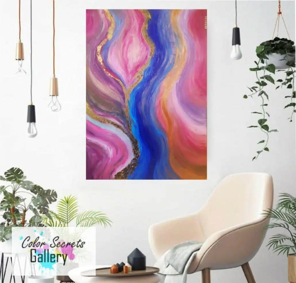 This is an abstract acrylic painting with the main colors pink, blue, gold and gold leaves.