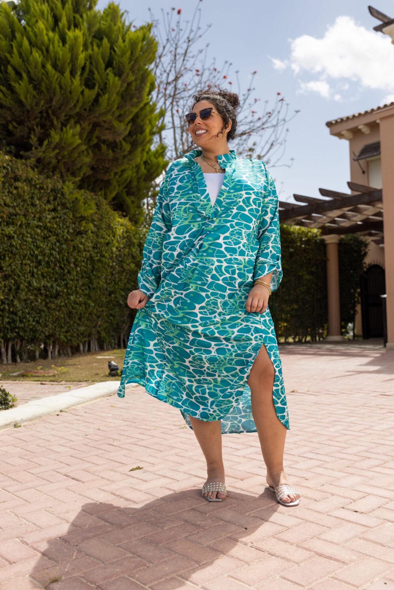 Satin dress with side slits.
