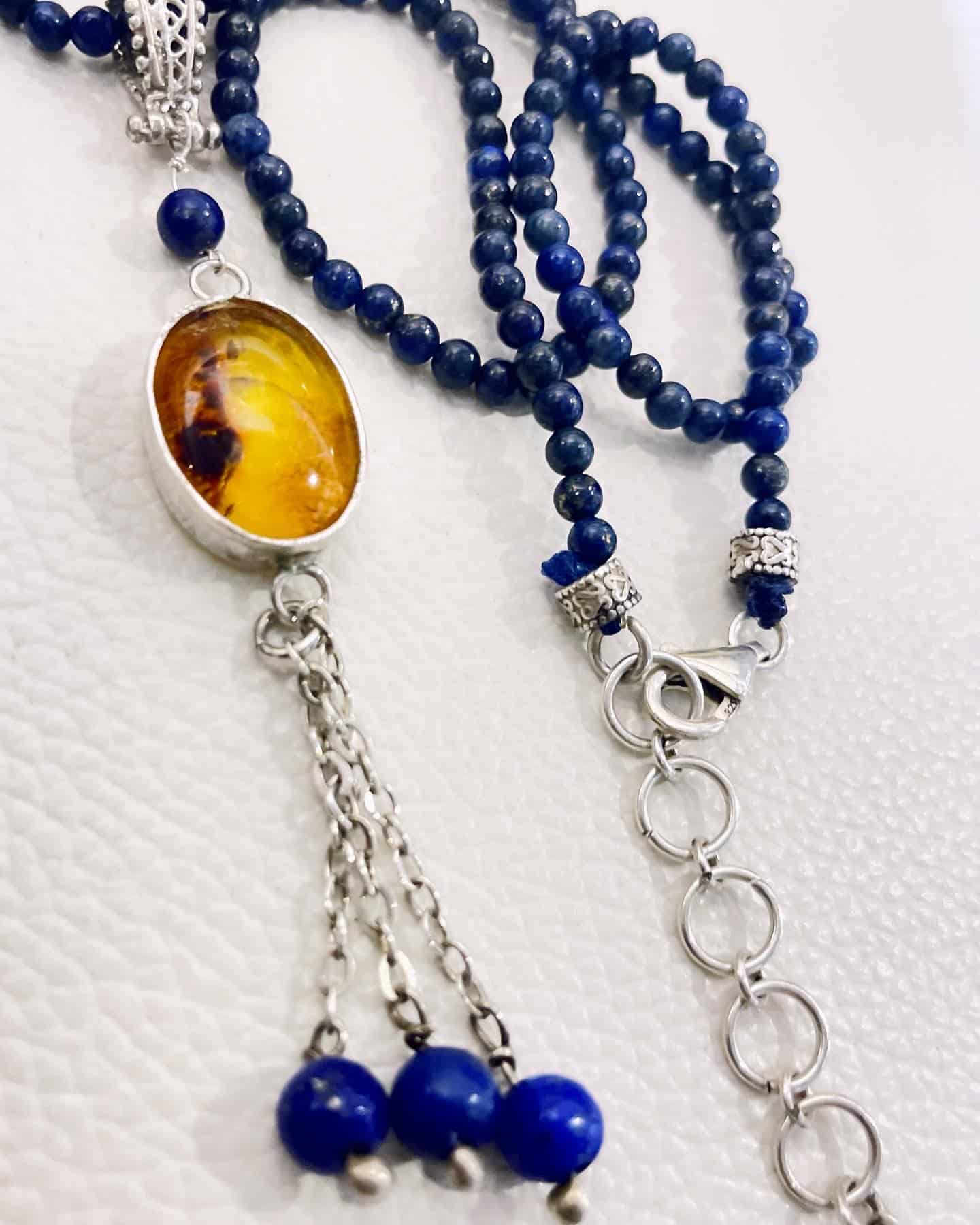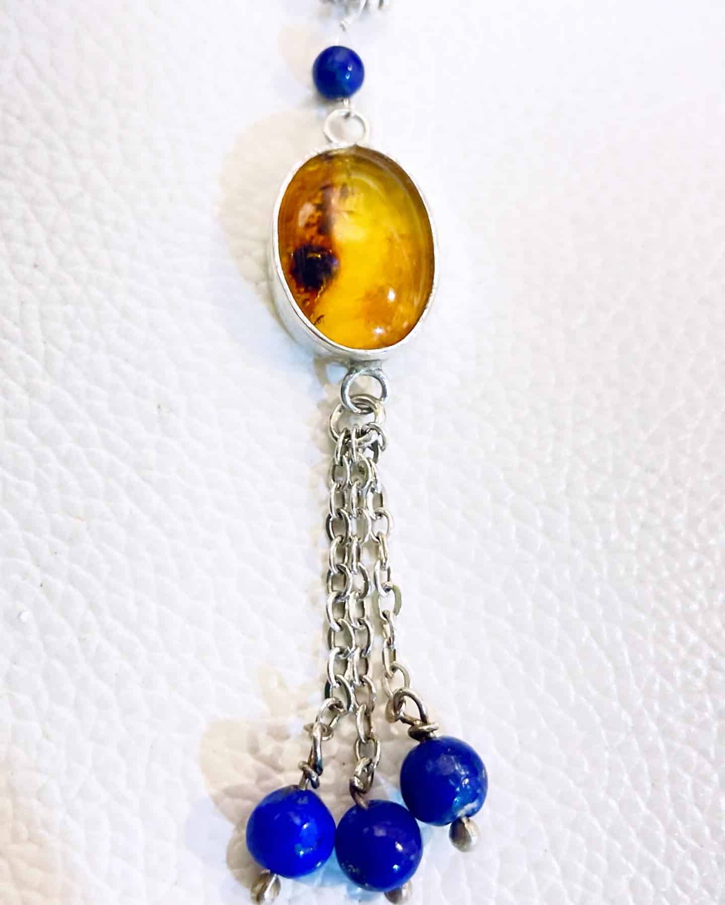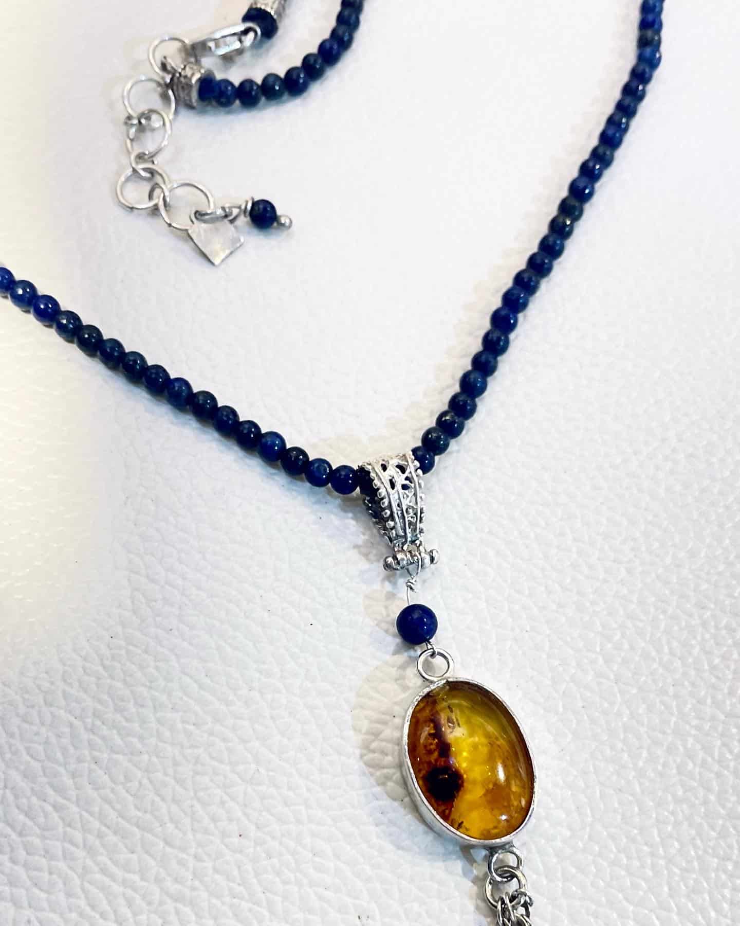 Silver 925 necklace, with amber stone and lapis lazoli beads