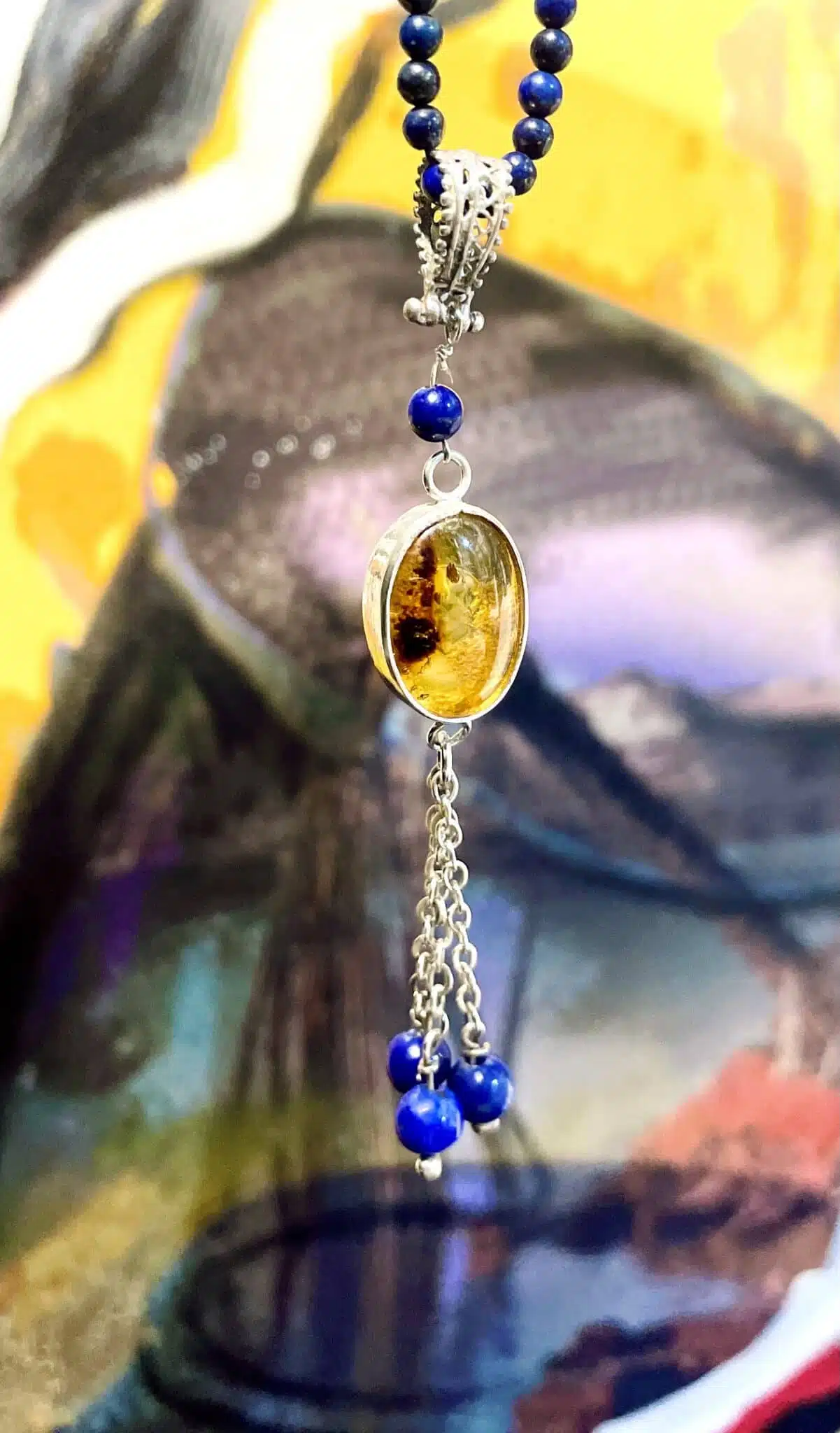Amber with Lapislazpli , and silver necklace