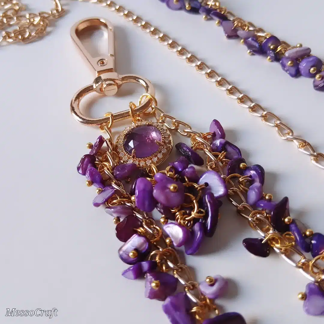 Made of irregular shaped chip gemstone beads in amethyst colour with a unique round pendant of a big amethyst diamond surrounded by tiny diamonds and Chinese gold chain
