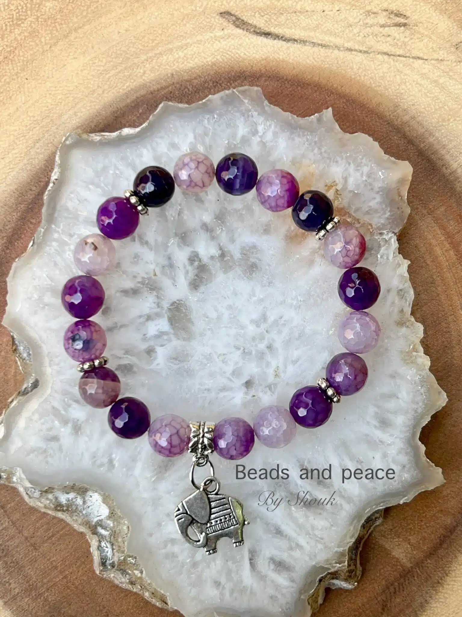 It’s gorgeous handmade stretch bracelet, made with 10 mm beautiful amethyst beads in deep purple and pale lavender color, silver plated elephant charm, it’s made with high quality elastic cord to make it easy for you to wear.