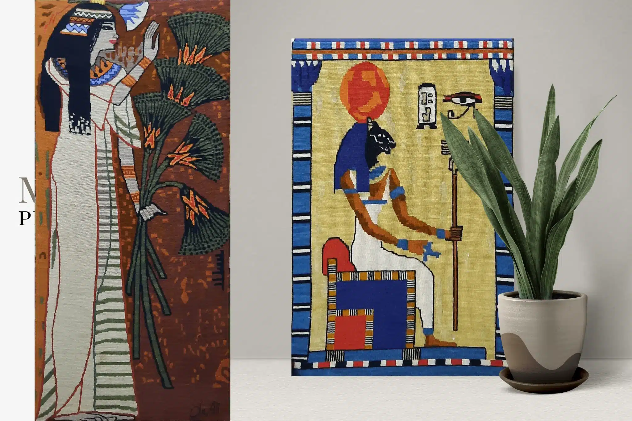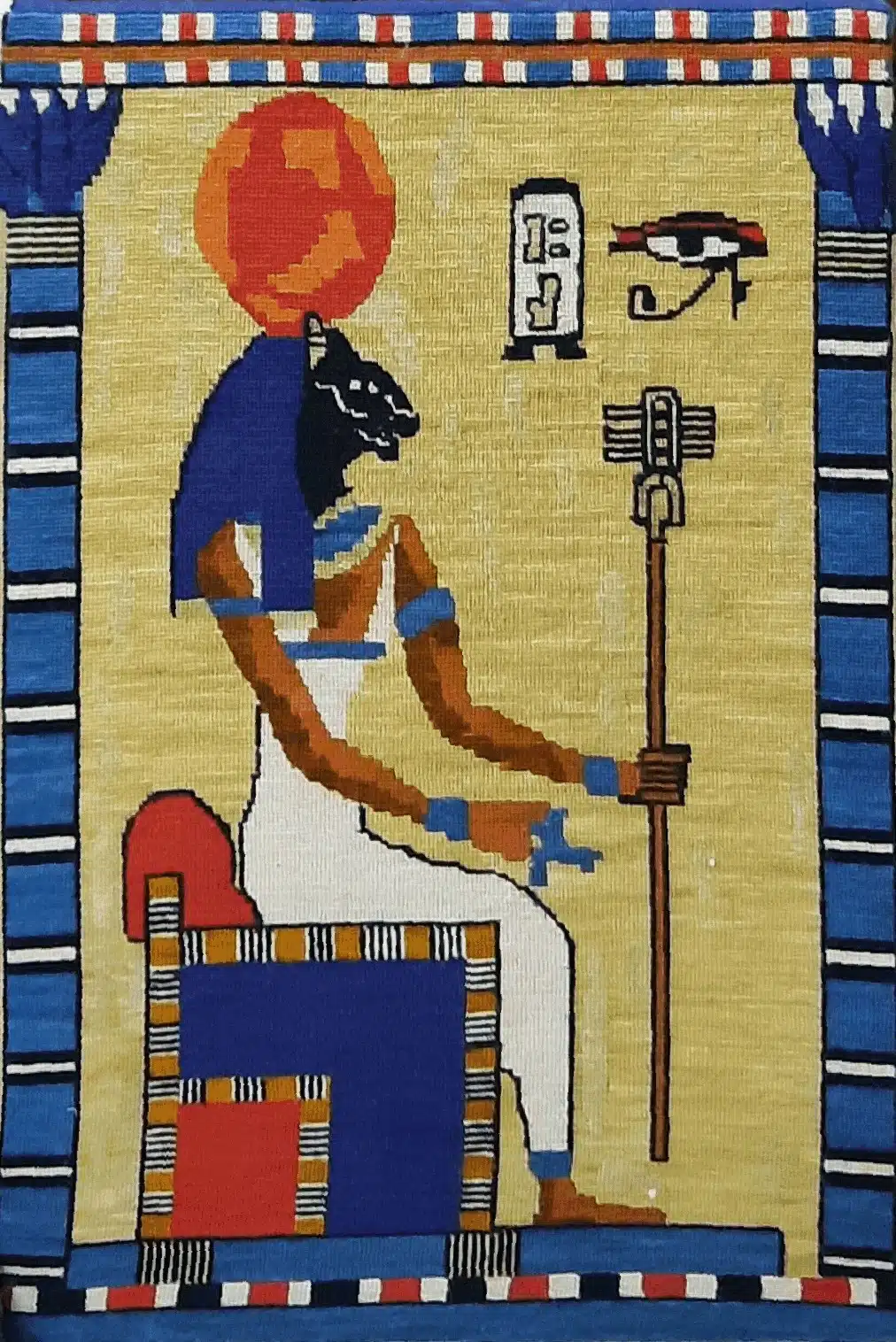 This striking textile artwork depicts a seated figure of a goddess from Ancient Egyptian mythology. The goddess is adorned with traditional attire and accessories, including the sun disk headdress and staff, symbolizing divine authority and protection. Hieroglyphic symbols and the Eye of Horus accentuate the cultural significance of the design. Vibrant hues of gold, blue, red, and white create a regal composition framed with traditional Egyptian-inspired borders.