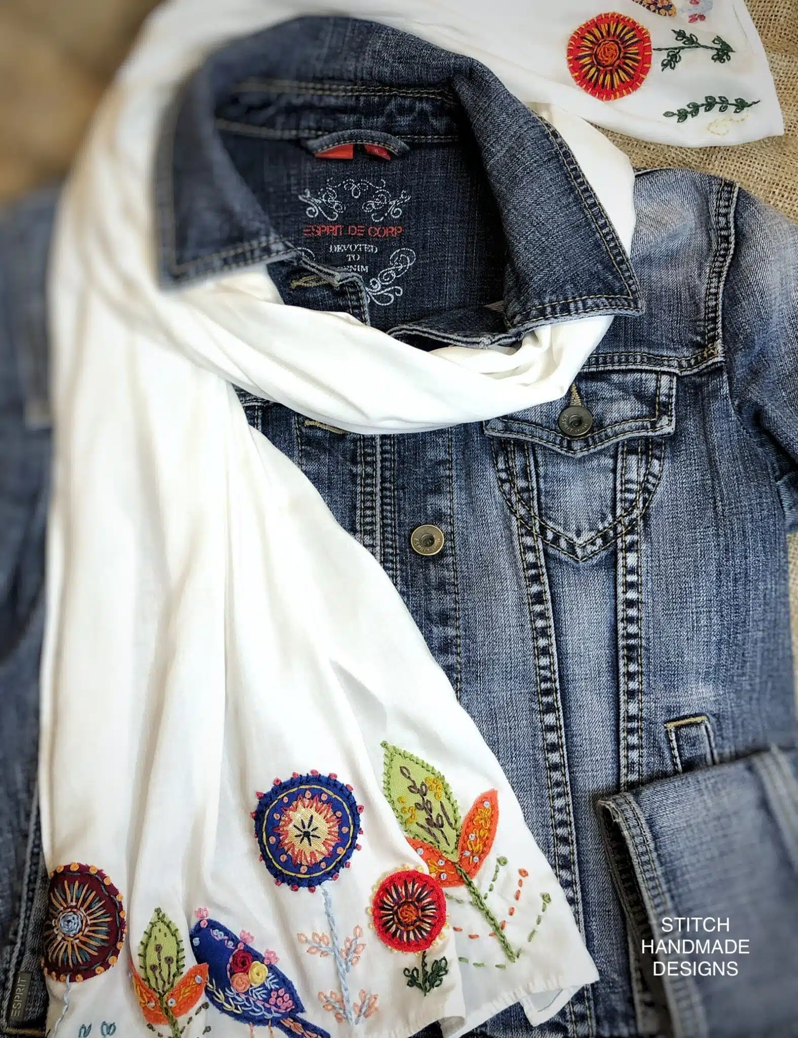Colorful linens embroidered with vibrant threads on viscose scarf .