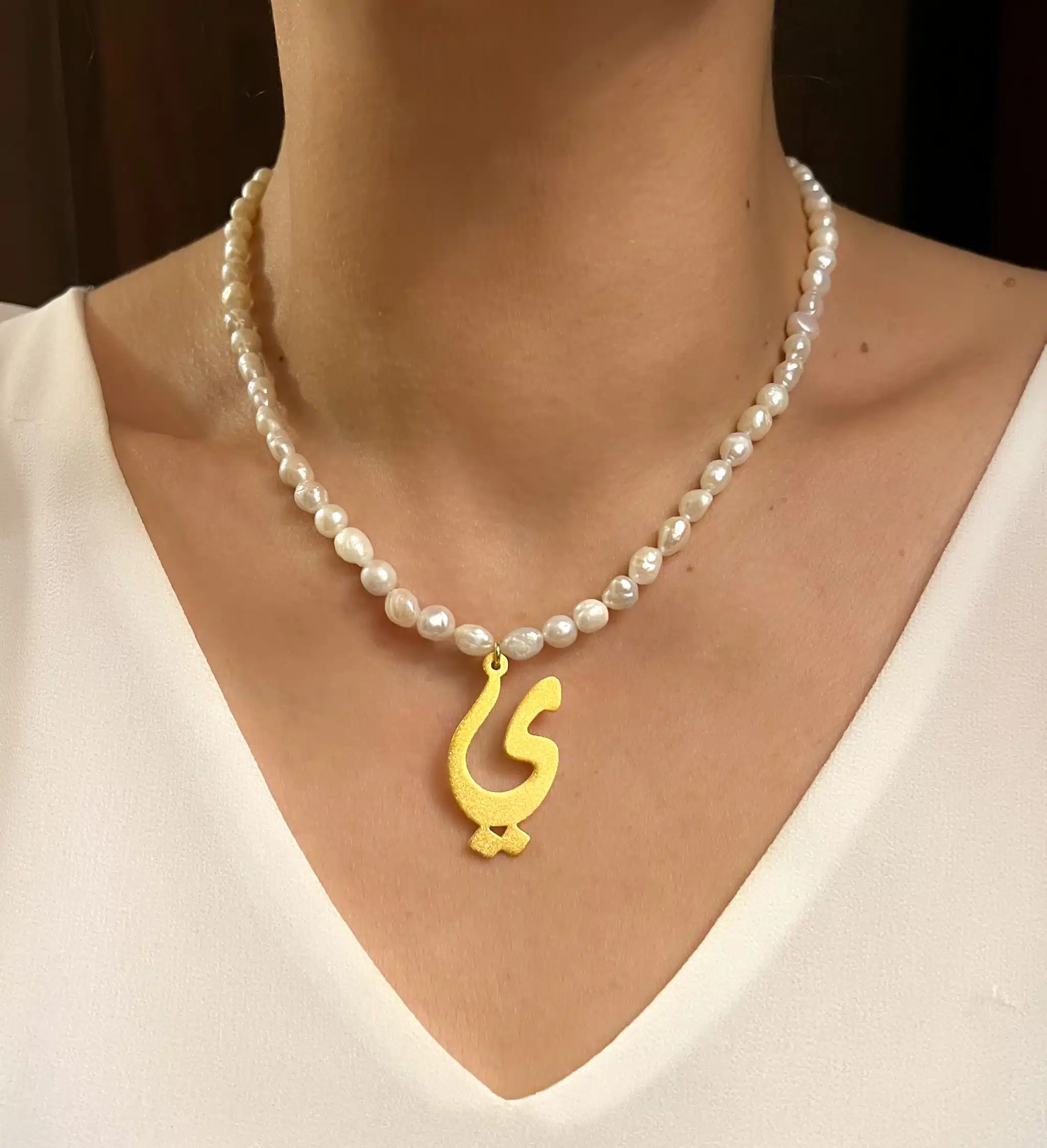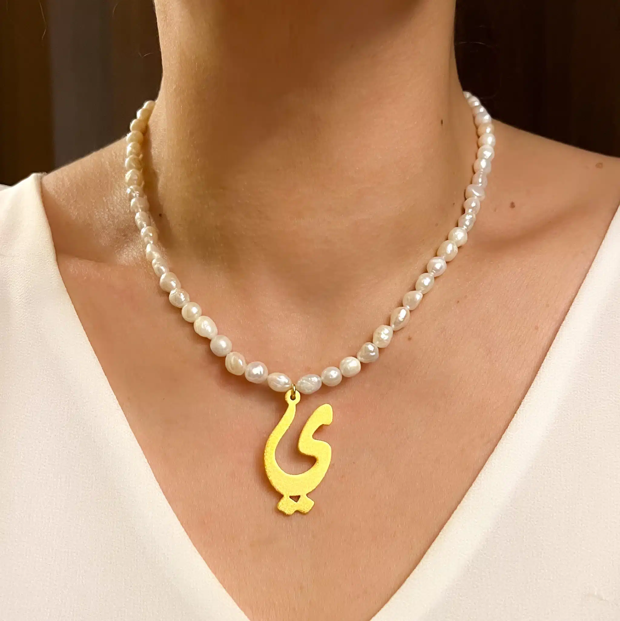 Materials : Gold plated Matt 21 carat Arabic calligraphy initials, Fresh natural pearls