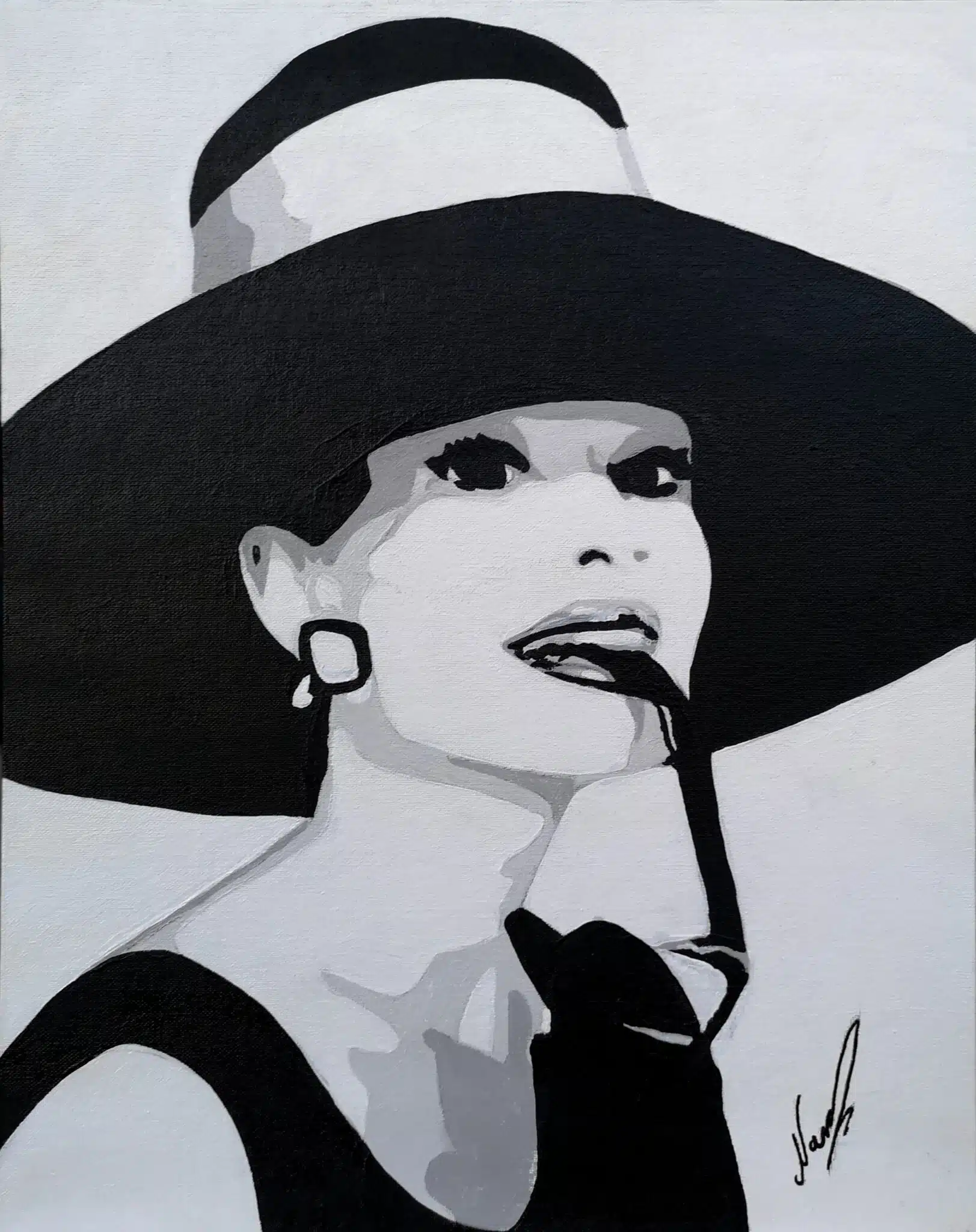 This is an acrylic painting of the actress Audrey Hepburn from the movie “Breakfast at Tiffany’s”.